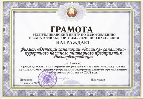 Решением Республиканского центра по оздоровлению и санаторно-курортному лечению населения филиал «Детский санаторий „Росинка“» занял первое место среди детских санаториев Республики Беларусь по результатам смотра-конкурса на лучшую санаторно-курортную оздоровительную организацию по итогам работы за 2008 год.